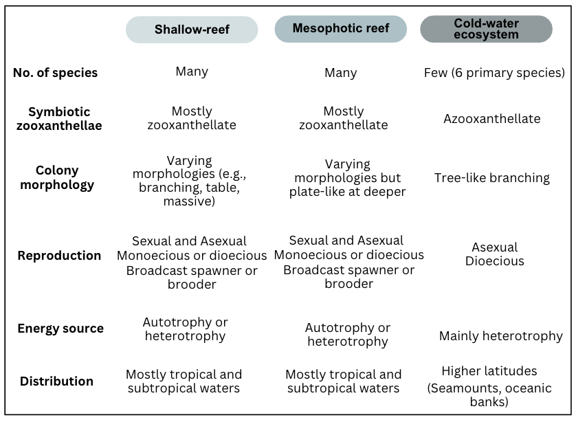 Table 1. Characteristics of scleractinian corals across depth-associated coral reef ecosystems. Data from Roberts et al. (2019); Baker et al. (2016); Frank et al (2011); Veron et al. (2009); Cairns (2007); Roberts & Cairns (2014); Dawson (2002).